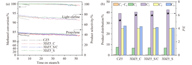 图4 3DZ5和CZ5催化剂的甲醇制丙烯反应性能:(a)甲醇转化率、丙烯及总轻质烯烃(C2=-C4=)选择性随反应时间的变化;(b)反应寿命期内各产物的平均选择性(P/E指丙烯选择性与乙烯选择性之比。