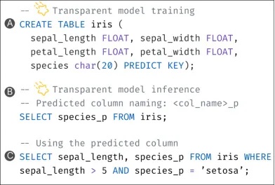 系统支持模型透明的预测分析。在这个例子中,“species”是iris表的目标预测列。在创建iris表之后,AISQL在加载数据时会自动触发模型训练过程。当数据量的增长超过阈值或数据分布发生变化时,AISQL会自动重新训练模型。用户无需手动创建模型,因此它非常易于使用。据我们所知,AISQL是第一个为在SQL中运行AI提供此类透明SQL接口的系统。