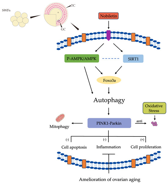 图 9 川陈皮素(Nob)对 D - 半乳糖(D-gal)诱导的早衰鸡卵巢颗粒细胞(GCs)具有保护作用。Nob 可通过激活 AMP 活化蛋白激酶 (AMPK) / Sirtuin-1 (SIRT1)-FOXO3a 信号通路,调控 D-gal 诱导的早衰颗粒细胞中的细胞吞噬作用与线粒体自噬;进而发挥抗氧化应激、抗炎作用,并缓解卵巢衰老。