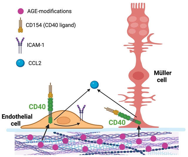 1. 聚焦糖尿病视网膜病变(DR)中,视网膜内皮细胞与 Müller 细胞 CD40 上调的驱动因素,首次系统探究晚期糖基化终产物(AGEs)在该过程中的作用;