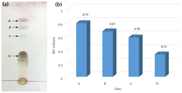 (a) Punica flowers乙醇提取物的TLC图像,(b) Punica flowers乙醇提取物的Rf值。