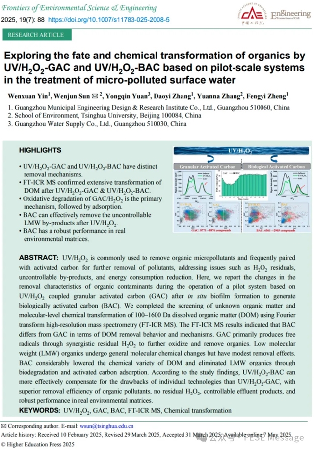 本文内容来自FESE期刊2025年第19卷第7期发表的研究文章“Exploring the fate and chemical transformation of organics by UV/H2O2-GAC and UV/H2O2-BAC based on pilot-scale systems in the treatment of micro-polluted surface water”。通讯作者为清华大学环境学院孙文俊研究员。