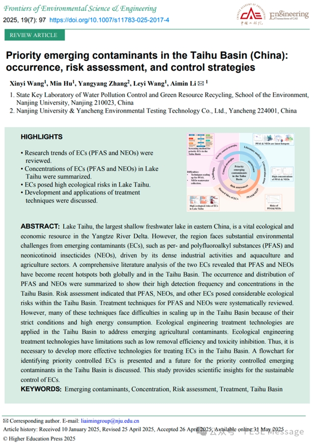 本文内容来自FESE期刊2025年第19卷第7期发表的综述文章“Priority emerging contaminants in the Taihu Basin (China): occurrence, risk assessment, and control strategies”。通讯作者为南京大学环境学院李爱民教授。