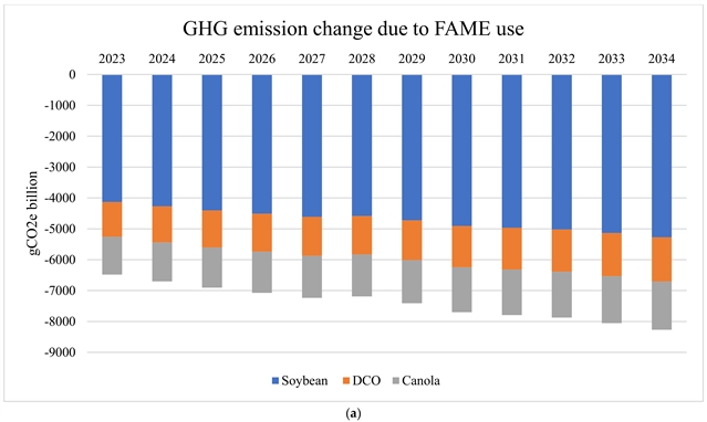 (a) 使用脂肪酸甲酯 (FAME) 生物柴油节省的美国温室气体排放量。(b) 使用可再生柴油 (RD) 节省的美国温室气体排放量。