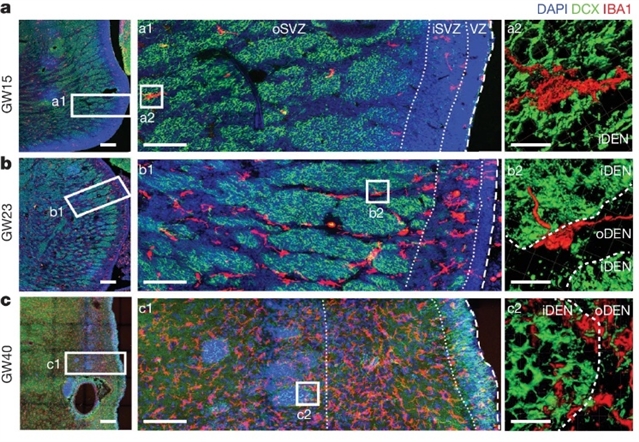 图一:在不同发育时期的人类MGE中, 小胶质细胞于妊娠周23周左右集中分布于iSVZ区域和巢状结构外侧的oSVZ区域