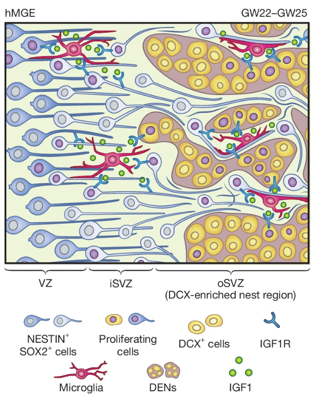 2025年8月6日,美国加州大学旧金山分校(UCSF)团队于《自然》(Nature)发表题目为 “Microglia regulate GABAergic neurogenesis in prenatal human brain through IGF1” 的研究论文。该研究首次证明小胶质细胞通过分泌胰岛素样生长因子1 (IGF1), 在人类胚胎大脑内侧神经节隆起(MGE)中促进中间神经元前体的增殖。这一机制在人类特异性存在,揭示了神经免疫相互作用在人类神经发育过程中起到了关键作用。