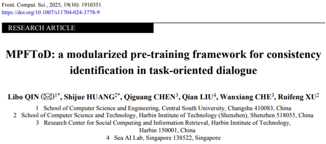 Libo QIN, Shijue HUANG, Qiguang CHEN, Qian LIU, Wanxiang CHE, Ruifeng XU. MPFToD: a modularized pre-training framework for consistency identification in task-oriented dialogue. Front. Comput. Sci., 2025, 19(10): 1910351