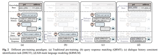 将CI-ToD预训练分解为三个子模块,并进一步独立预训练每个模块。具体来说,我们设计了三个预训练任务,包括(1)查询-响应匹配任务(QRMT),旨在学习在给定系统响应的情况下区分正确的用户查询,这鼓励我们的框架更好地建模系统响应和用户查询之间的关系;(2) 对话历史一致性识别任务(DHCIT)用于判断对话历史是否与系统响应一致,提高对话语境理解能力;以及(3)KB掩码语言建模(KBMLM)在给定话语和相应的KB的情况下预测属于KB实体的掩码值,从而在话语和KB之间建立桥梁,提高KB理解能力。