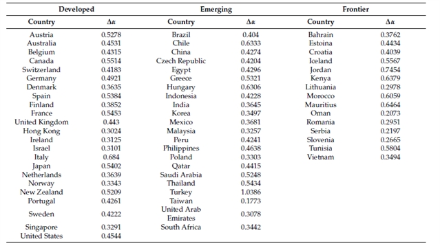 衡量市场效率异质性。在发达组中,香港股市效率最高,而意大利股市效率最低。在新兴组中,台湾和土耳其股市分别拥有最高和最低的效率;在新兴组中,阿曼和约旦分别拥有前沿组中效率最高和最低的股市;在所有国家中,台湾和土耳其分别拥有最高和最低的股市效率。