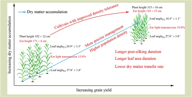 不同玉米品种的植株性状受基因型影响差异较大,决定了密植条件下光的最佳垂直分布。研究表明,低密度种植往往导致叶面积指数小、产量低,建议选择叶片角度大的品种避免辐射资源浪费,且需考虑植株性状优化冠层光分布。高密度种植则应选择叶片角度小、适应密植的品种 (图1)。