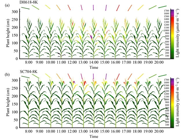 玉米群体结构对太阳辐射的垂直分布影响很大,进而影响作物的生长发育。过高的种植密度会导致冠层内辐射分布不均,缩短光合作用时间,降低光合效率,不利于产物的积累。因此,适宜群体结构对密植条件下的增产至关重要。品种在一定程度上影响着群体结构,适应高密度的品种可调节群体微气候,通过密植提高产量潜力。