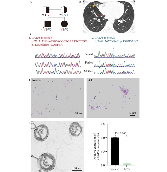 研究团队对两个不相关的原发性纤毛运动障碍患者家庭进行了深入研究。第一个家庭的先证者为32岁男性,因反复咳痰1年于2014年在北京协和医院被诊断为支气管扩张。通过全外显子测序和Sanger测序,发现该患者携带CFAP54的复合杂合突变,包括母源的移码缺失突变c.2649_2657delinC(p.E883Dfs*47)和父源的框内插入突变c.7312_7313insCGCAGGCTGAATTCTTGG(p.T2438delinsTQAEFLA),这两种突变在GnomAD数据库中均为新发现。ACMG将移码缺失突变归类为致病性,框内插入突变归类为可能致病性。对该先证者的精子鞭毛进行H&E染色和透射电镜观察,发现精子鞭毛短小或缺失,精子头部聚集,轴丝的“9+2”超微结构不完整,且精子中CFAP54的mRNA表达较正常对照显著降低(图1)。