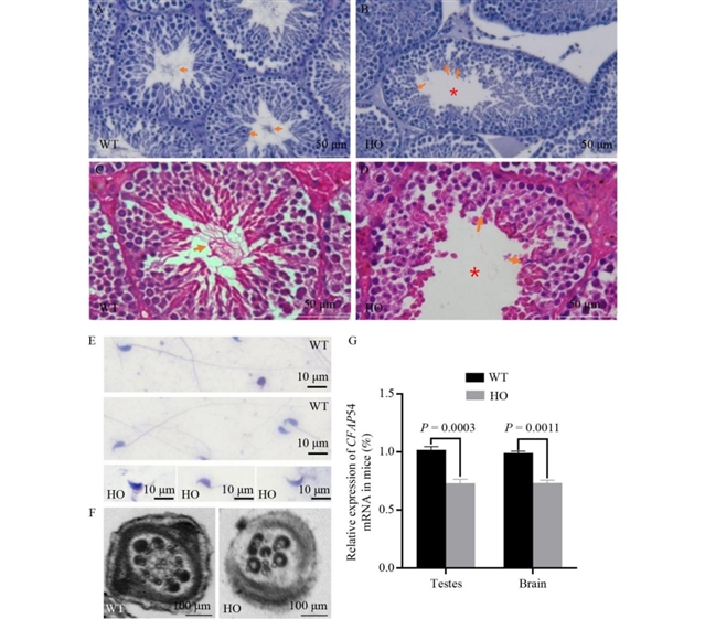 对存活超过8周的野生型和纯合子敲入小鼠的生精小管进行切片和H&E染色,发现野生型小鼠的精子细胞在精子发生过程中伸长,精子鞭毛延伸至生精小管管腔,而纯合子敲入小鼠的生精小管管腔中鞭毛数量减少,表明精子细胞的伸长阶段受到影响(图5)。附睾精子的H&E染色显示,突变小鼠的精子鞭毛缺失或缩短。透射电镜观察发现,野生型小鼠的鞭毛横切面为正常的“9+2”结构,而纯合子敲入小鼠的精子鞭毛组装异常且完全紊乱,但野生型和纯合子敲入小鼠的呼吸道运动纤毛超微结构未观察到显著差异。qPCR分析显示,CFAP54基因在野生型小鼠的睾丸、肺和脑中高表达,而纯合子敲入小鼠的睾丸和脑中该基因的表达呈下降趋势,但肺中mRNA表达无统计学显著差异,提示CFAP54功能障碍可能影响精子发生并导致不孕。