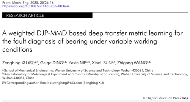 Zengbing XU(徐增丙), Gaige DING(丁改革), Yaxin NIE(聂雅新), Xiaoli SUN(孙晓莉), Zhigang WANG(王志刚). A weighted DJP-MMD based deep transfer metric learning for the fault diagnosis of bearing under variable working conditions. Front. Mech. Eng., 2025, 20(2): 16 https://doi.org/10.1007/s11465-025-0836-4