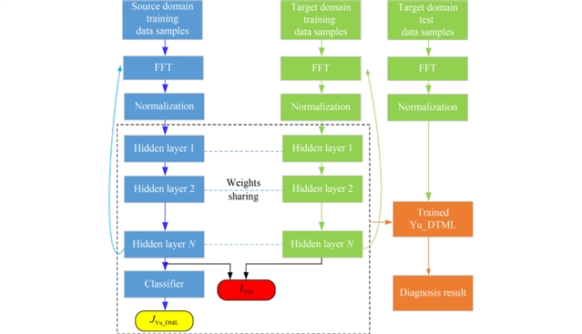 Yu_DTML(WDJP-MMD)的诊断算法步骤如下:首先通过滑动时间窗口采集源域和目标域振动信号数据样本;然后对数据样本的频域单边幅值谱进行归一化,得到归一化频域样本;接着初始化Yu-DML模型参数;再利用源域频域样本和少量带标签的目标域频域样本训练Yu_DTML(WDJP-MMD)模型;最后用训练好的模型对目标域无标签测试样本进行诊断。