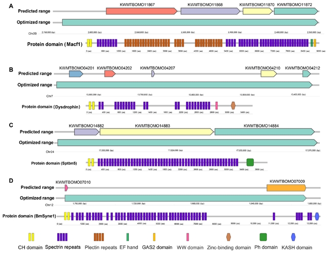 图1. BmMacf1、BmDys、BmSptbn5和BmSyne1优化前、后的基因结构和蛋白质结构域特征