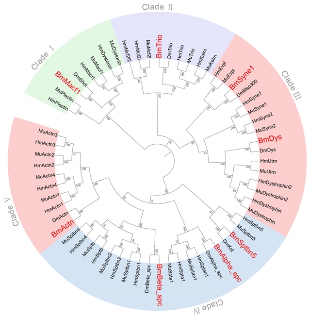 系统发生分析显示,血影蛋白家族基因在物种间是保守的。与昆虫相比,小鼠和人类的血影蛋白家族成员发生了扩张。如家蚕和果蝇中仅有基因1个Actn基因,而在小鼠和人类中存在4个Actn基因拷贝 (Actn1、Actn2、Actn3、Actn4)。