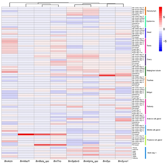 通过转录组分析了血影蛋白家族基因在家蚕17个组织 (生殖腺、表皮、血淋巴、丝腺等),9个发育时期 (4龄3天至蛹7天) 的时空表达模式,结果显示,血影蛋白家族基因在家蚕的多个组织和时期均有表达,如BmBeta_spc在幼虫的精巢、卵巢、中肠及成虫的胸、头、腿、脂肪体等组织表达。