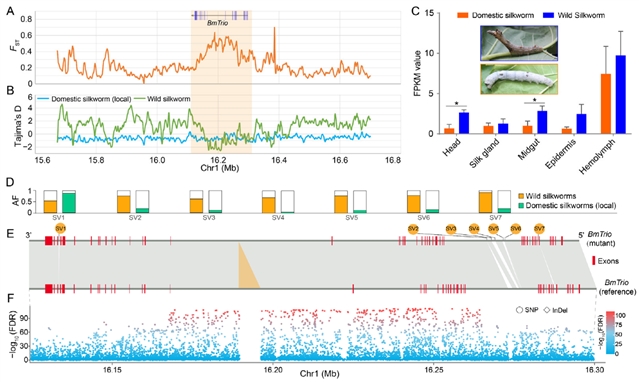 群体遗传分析显示BmTrio基因区域有强烈的人工选择信号,该区域内鉴定到7350个SNPs、1161个InDels和7个Vs在野桑蚕与和家蚕地方种群体间存在显著分化,BmTrio在野桑蚕头部和中肠的表达显著高于家蚕,提示其可能参与蚕的行为驯化。