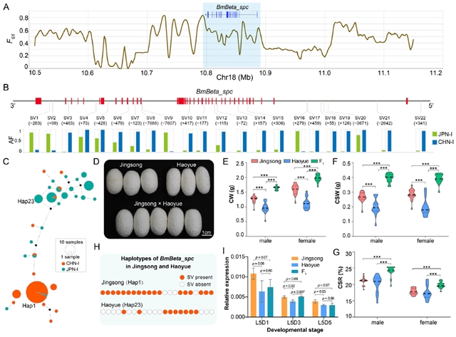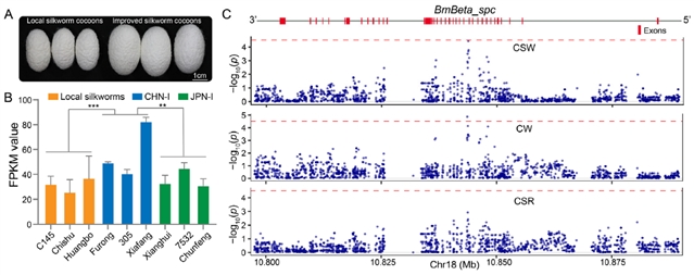 本课题组前期研究已发现BmBeta_spc是中国实用种 (CHN-I) 改良的潜在靶点,本研究新鉴定到1945个SNPs、162个InDels、28个SVs在地方种和中国实用种亚群间有显著分化。关联分析显示该基因与茧丝产量有显著相关性,且在中国实用种丝腺中表达量显著高于地方种和日本实用种 (JPN-I)。
