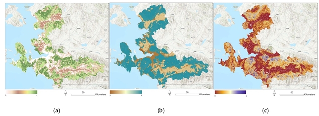 图为伊兹密尔的栖息地质量 (a)、碳储存与固碳 (b) 以及泥沙输送比率 (c)。