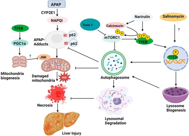 对乙酰氨基酚(APAP)过量是西方国家急性肝衰竭的主要原因,现有N-乙酰半胱氨酸(NAC)疗法存在治疗时间窗限制,亟需开发对乙酰氨基酚诱导性肝损伤(AILI)的新疗法。AILI的肝脏发病机制涉及:1) 5–9%的APAP通过细胞色素P450酶主要是细胞色素P450 2E1(CYP2E1)和CYP1A2)代谢,形成高活性代谢物N-乙酰-对苯醌亚胺(NAPQI),过量的NAPQI会与细胞内蛋白质共价结合,形成胞浆和线粒体APAP蛋白加合物(APAP加合物),导致线粒体损伤和氧化应激增加,进而激活c-Jun N末端激酶(JNK)并释放线粒体内切酶G和凋亡诱导因子,引发DNA断裂和肝细胞坏死;2)JNK通路激活导致DNA断裂和肝细胞坏死。修复期呈现双重调节:血液中的巨噬细胞可通过清除死亡细胞和诱导中性粒细胞死亡来帮助解决损伤,在AILI恢复后期,肝脏血小板聚集增加会抑制肝脏再生。研究发现自噬通过SQSTM1/p62(p62)等受体蛋白清除毒性加合物,而转录因子EB(TFEB)可同时调控溶酶体和线粒体生物合成。因此,靶向p62/TFEB通路可能成为治疗APAP肝损伤的新策略。