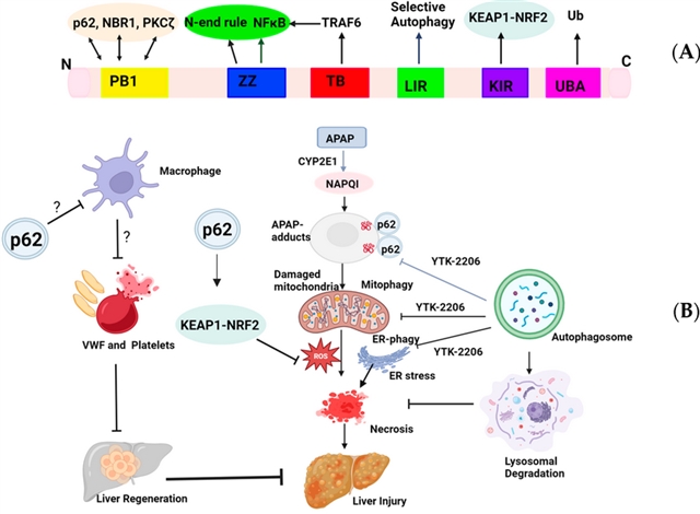 研究证据表明,p62蛋白通过多重机制参与AILI的调控。作为多功能支架蛋白,p62通过其PB1、ZZ、LIR、KIR和UBA等结构域分别参与自噬体形成、N-端规则降解途径、选择性自噬、NRF2通路激活和泛素化蛋白识别等过程。在AILI早期,p62通过促进APAP蛋白加合物和受损线粒体的自噬清除发挥保护作用,实验显示p62敲除小鼠肝内加合物积累加重,而p62激动剂YTK-2205可增强线粒体自噬减轻损伤。此外,p62还能通过KEAP1-NRF2通路促进抗氧化酶表达。但在AILI恢复期,p62可能通过增加肝内血管性血友病因子(VWF)分泌促进血小板聚集而抑制肝再生。这些发现提示p62在AILI不同阶段具有双重作用,其靶向治疗策略需根据病程阶段进行调整,尤其需要关注其在肝再生期调控凝血机制的作用。