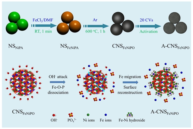 高熵型非晶态 Fe-Ni-P-O-C 纳米球(CNSFeNiPO)在电位驱动活化过程中,呈现显著的铁离子迁移现象和稳定的刚性骨架,促进了电催化剂表面重构及其电催化析氧反应活性和稳定性。