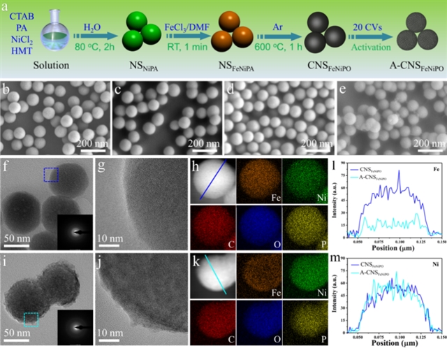 图1.(a)CNSFeNiPO和A-CNSFeNiPO的典型制备流程;(b)NSNiPA;(c)NSFeNiPA;(d)CNSFeNiPO和(e)A-CNSFeNiPO的扫描电子显微镜图像;(f-h)CNSFeNiPO和(i-k)A-CNSFeNiPO的透射电子显微镜图像及选区电子衍射图(插图)、高分辨透射电子显微镜图像,以及相应的电子能量损失谱元素映射图; CNSFeNiPO和A-CNSFeNiPO的(l)铁基、(m)镍基线扫描能量色散X射线光谱(EDS)图。