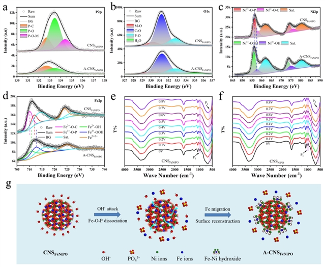 图2 . CNSFeNiPO和A-CNSFeNiPO的(a)P 2p;(b)O1s;(c)Ni 2p和(d)Fe 2p的高分辨率XPS光谱;(e)CNSFeNiPO和(f)NSNiPO在1 M KOH中,于特定电压下活化100秒后,相对于Ag/AgCl从0 V到0.8 V记录的原位傅里叶变换红外光谱;(g)镍基磷酸盐-碳纳米球的迁移铁离子诱导的表面重构机理