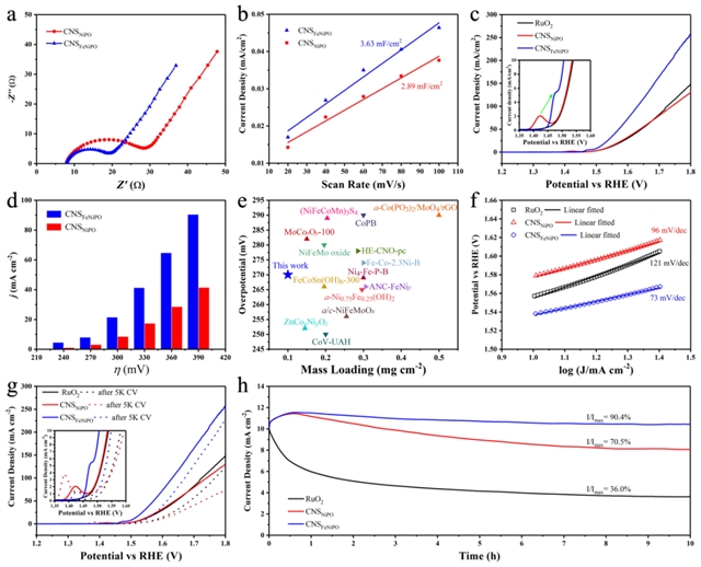 图3.(a)CNSNiPO和CNSFeNiPO的电化学阻抗谱(EIS);(b)CNSNiPO和CNSFeNiPO在1.21V时的双电层电容(Cdl),由不同扫描速度下记录的循环伏安(CV)曲线得出;(c)初始状态下的线性扫描伏安法(LSV)曲线;(d)CNSNiPO和CNSFeNiPO的j-η关系,以及(e)基于质量负载和过电位的电化学性能比较;(f)从初始LSV曲线得出的塔菲尔斜率;(g)5000次CV循环后的LSV曲线,以及(h)CNSFeNiPO、CNSNiPO和RuO2的计时电流法(CA)曲线。