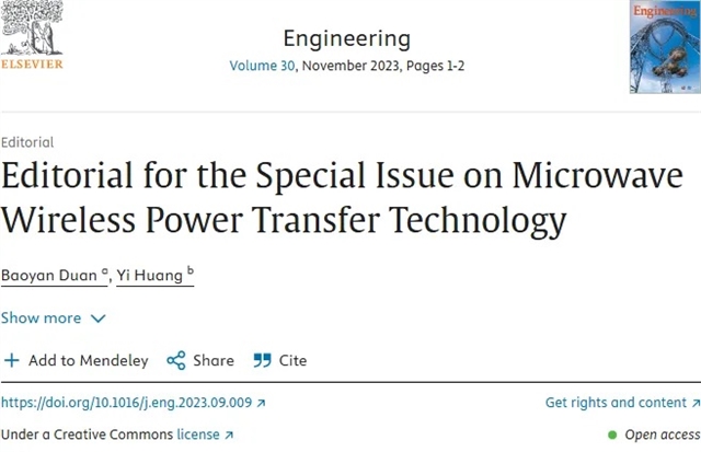 Baoyan Duan, Yi Huang. Editorial for the Special Issue on Microwave Wireless Power Transfer Technology. Engineering, https://doi.org/10.1016/j.eng.2023.09.009