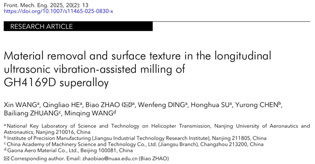 Xin WANG(王欣), Qingliao HE(何清燎), Biao ZHAO(赵彪), Wenfeng DING(丁文锋), Honghua SU(苏宏华), Yurong CHEN(陈玉荣), Bailiang ZHUANG(庄百亮), Minqing WANG(王民庆). Material removal and surface texture in the longitudinal ultrasonic vibration-assisted milling of GH4169D superalloy. Front. Mech. Eng., 2025, 20(2): 13