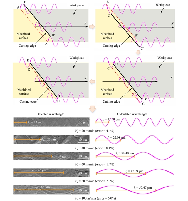LUVM中刀具的超声振动改变了切削刃运动路径,影响材料去除过程和切削性能。刀具切削刃路径方程由进给速度、铣削速度和纵向超声振动速度决定,可简化为旋转运动和纵向超声振动的组合。材料去除方面,LUVM中切削刃运动在单个超声振动周期内分为四个阶段,非切削时切削刃施加的铣削力低于铣削时施加的铣削力,有助于降低加工力和抑制刀具磨损。通过运动学分析建立非切削时间比模型,非切削时间比随超声振动频率、振幅和螺旋角增加而增加,随主轴转速增加而减小。此外,LUVM加工表面纹理符合正弦曲线方程,振动纹理波长随铣削速度增加而增加。