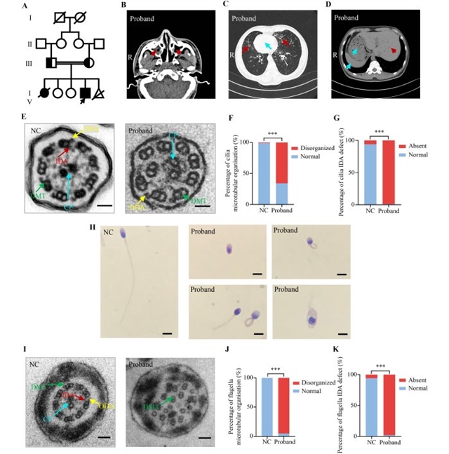 研究首先纳入了一名来自近亲婚配家庭的28岁男性患者。该患者自儿童期起出现反复咳嗽、脓痰和鼻塞,影像学检查显示慢性鼻窦炎、支气管扩张、右位心及腹腔内脏反位,鼻一氧化氮水平(24 nL/min)显著低于原发性纤毛运动障碍参考阈值(77 nL/min),符合原发性纤毛运动障碍的诊断标准。进一步分析其呼吸道纤毛和精子鞭毛的超微结构发现,患者纤毛和鞭毛的9+2轴丝结构严重紊乱,内动力臂缺失,精子形态异常且完全不动,表现为严重的弱畸精子症(图1)。