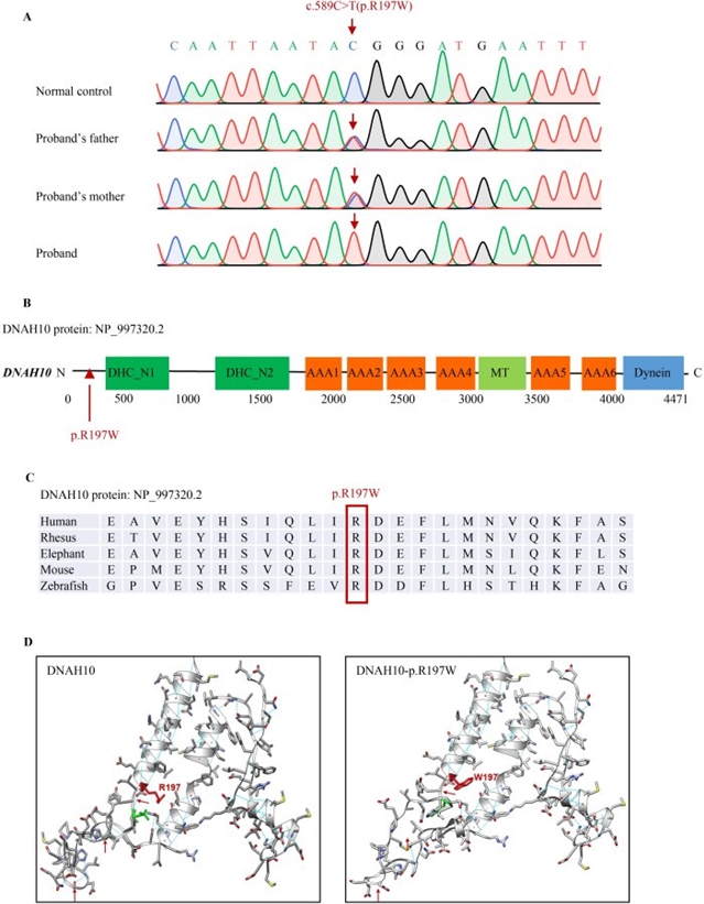 原发性纤毛运动障碍(PCD)是一种遗传性运动型纤毛疾病,以多系统症状为特征,约50%的患者表现为卡塔格内综合征,即慢性鼻窦炎、支气管扩张和内脏反位。此外,患者还可能出现因精子鞭毛或输卵管纤毛功能异常导致的生育力下降,以及因室管膜纤毛运动障碍引发的脑积水。尽管目前已发现约50个致病基因,但它们仅能解释约70%的原发性纤毛运动障碍病例,仍有部分患者的病因未被揭示。运动纤毛和精子鞭毛具有进化保守的微管轴丝结构(9+2结构),其运动依赖于附着在周围微管上的内动力臂(IDA)和外动力臂(ODA)水解ATP提供能量。动力蛋白轴丝重链10(DNAH10)编码运动纤毛和精子鞭毛内动力臂的重链亚基,此前研究发现其突变可导致男性不育或斑马鱼侧位异常,但尚未有研究明确其与人类原发性纤毛运动障碍的关联。