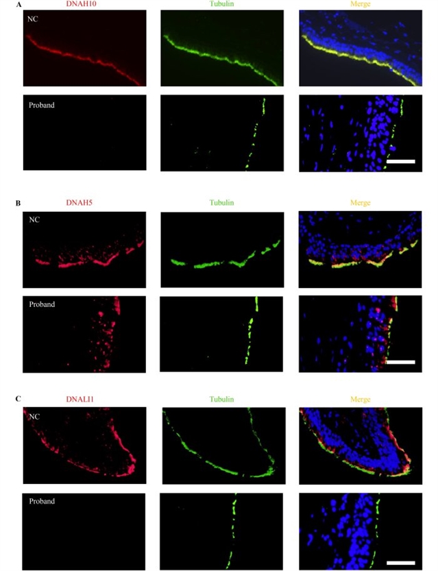 图3 携带DNAH10 纯合变异的原发性纤毛运动障碍先证者呼吸道纤毛中DNAH10和DNALI1缺失