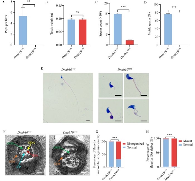 图5 Dnah10缺陷导致Dnah10M/M小鼠精子鞭毛超微结构和运动功能缺陷