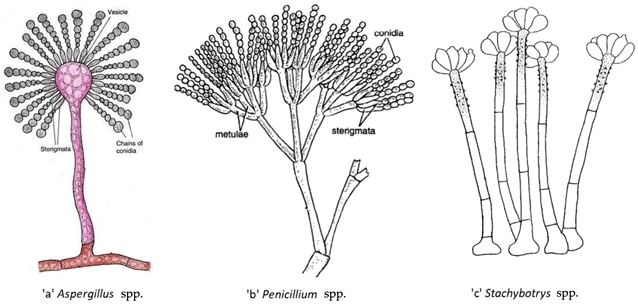 •在建筑材料表面和室内空气中,最常见的真菌种类包括曲霉(Aspergillus)、青霉(Penicillium)、枝孢菌(Cladosporium)和葡萄穗霉(Stachybotrys)。