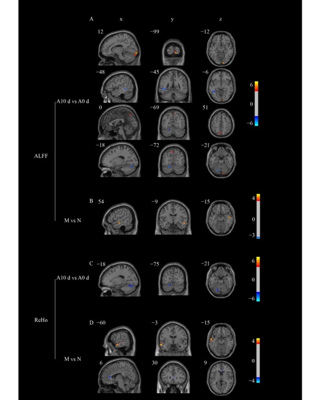 图2 各组间低频振幅(ALFF)与区域同质性(ReHo)的显著差异
