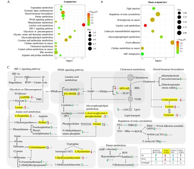 代谢组学和蛋白质组学研究共筛选出166种受针灸影响的差异代谢物及14种差异蛋白,其中25种代谢物和2种蛋白同时与偏头痛相关。进一步整合分析表明,针灸的抗偏头痛机制涉及复杂的网络调控,主要与缺氧应激反应调节、脑能量代谢失衡逆转及炎症调控相关,具体涉及缺氧诱导因子(HIF)-1信号通路、亚油酸代谢、甘油磷脂代谢等通路;而假针灸主要影响甘油磷脂代谢和肌动蛋白细胞骨架调节通路,与针灸的作用机制存在显著差异(图3)。此外,研究还发现,针灸对代谢物和蛋白质的影响可能早于对脑区活动的影响,提示脑区变化可能是疾病改善的结果而非原因。
