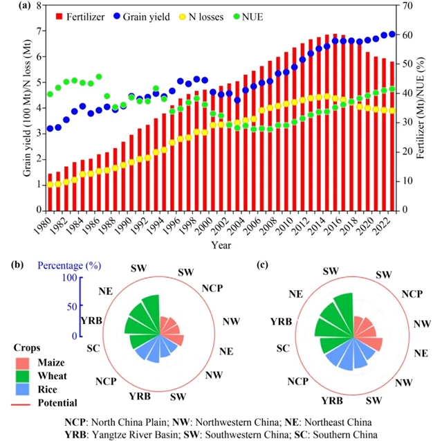 图1 (a) 1980年至2022年中国粮食产量、氮肥使用量、养分利用效率 (NUE) 和氮损失的历史变化;(b) 主要产区玉米、小麦、水稻的粮食产量,(c) 主要产区玉米、小麦、水稻的养分利用效率差距。