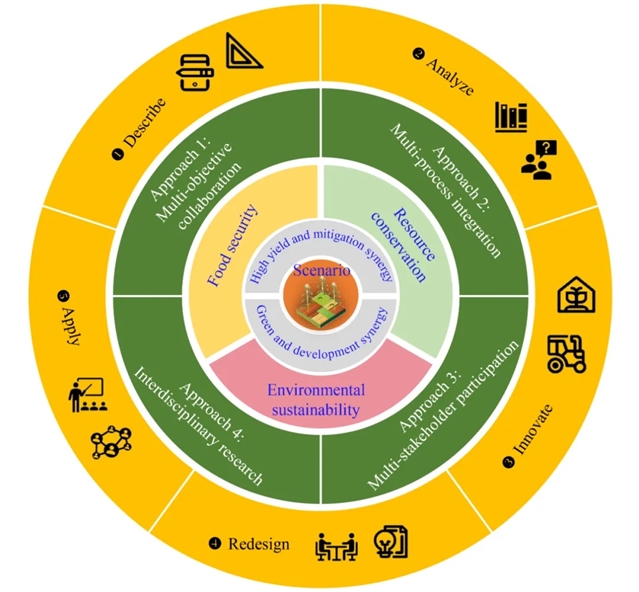 4个原则方法:包括多目标协同 (产量、效率、环境、收入),多过程集成 (种植-施肥-收获),多主体参与 (政府、企业、农民、科研),跨学科融合 (农学、生态、工程);
