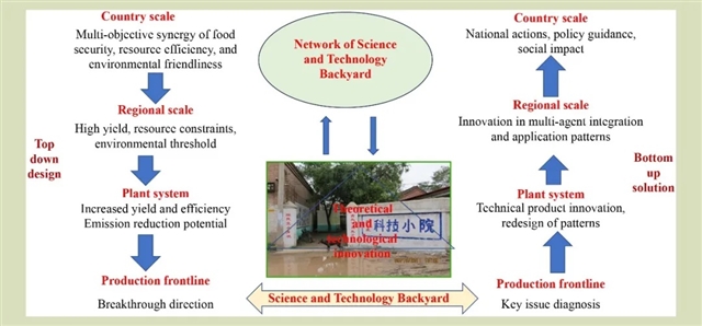 本文提出的这种整合了自上而下和自下而上的系统方法,有助于理解农业系统内各组成部分之间的相互联系。本文对农业生产目标进行定量分析并找出解决方案,因此代表了农业研究发展的一种新范式。与常用的单因素试验相比,这种整体方法能够应对未来农业面临的多方面挑战 (平衡生产力、资源效率和环境可持续性)。本文提供的实证案例研究证实了这种方法的可行性,表明了科技小院网络是整合创新的基石。作为科研与实际应用之间的动态桥梁,科技小院网络具有以下关键作用:(1) 捕捉一线生产中的具体问题和数据;(2) 开展技术创新以突破瓶颈技术;(3) 通过适应性推广模式传播解决方案,最终在提高生产力的同时最大限度减少环境污染。本文贡献了一个超越传统学科界限的系统创新框架。通过整合自上而下的系统优化与自下而上的适应性管理,为未来的农业研究提供了一种可靠的方法。随着全球粮食系统面临日益加剧的气候和人口压力,这种整合方法是在环境阈值内实现高产高效的关键一步。