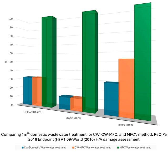 综合评估:CW系统的环境负担最低,是可持续的废水处理选择;而集成MFC可提升处理效率并发电,在环境与运行效益间取得平衡。尽管MFC能回收能源,但其高材料与制造需求限制了大规模应用。CW-MFC系统结合了CW的生态优势与MFC的创新能力,成为有前景的替代方案。