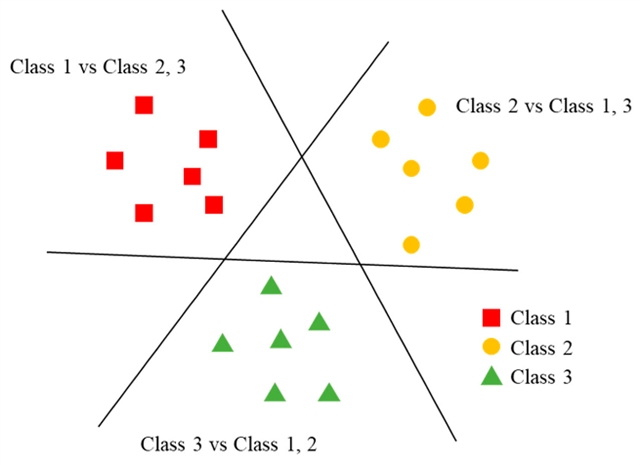 一对多分类器(OVR)架构示意图,多个SVM分别划分不同异常类型的决策边界。