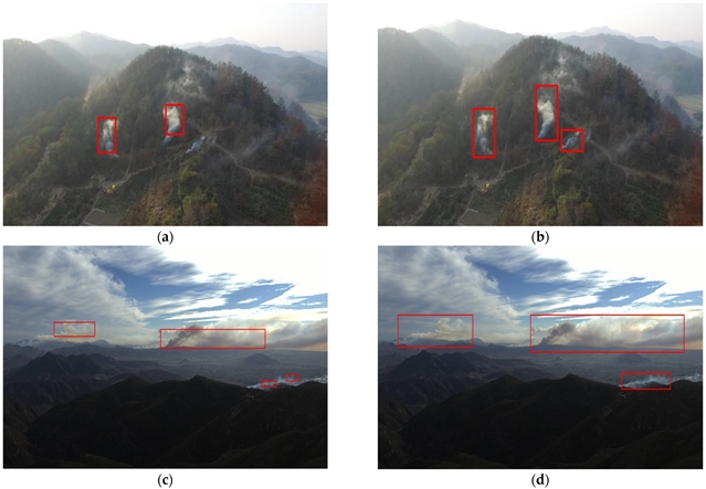 图2.使用迭代边界框组合方法前后的不同检测样本图。(a,c)原始检测结果;(a)包含一个漏检;(c)包含一个误检。(b,d)更新后的检测结果,其中边界框由我们的方法生成。(b,d)中的边界框均能准确覆盖整个烟雾
