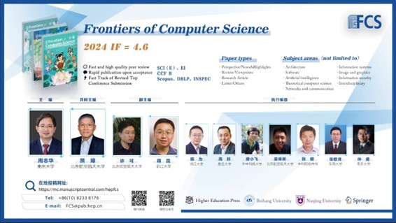 Frontiers of Computer Science (FCS)是由教育部主管、高等教育出版社和北京航空航天大学共同主办,南京大学支持,SpringerNature 公司海外发行的英文学术期刊。本刊于 2007 年创刊,月刊,全球发行。主要刊登计算机科学领域具有创新性的综述论文、研究论文等。本刊主编为周志华院士,共同主编为熊璋教授。编委会及青年 AE 团队由国内外知名学者及优秀青年学者组成。本刊被 SCI、Ei、DBLP、INSPEC、SCOPUS 和中国科学引文数据库(CSCD)核心库等收录,为CCF 推荐B类期刊;两次入选“中国科技期刊国际影响力提升计划”;入选“第4届中国国际化精品科技期刊”;两次入选“中国科技期刊卓越行动计划”(一期梯队、二期领军)。
