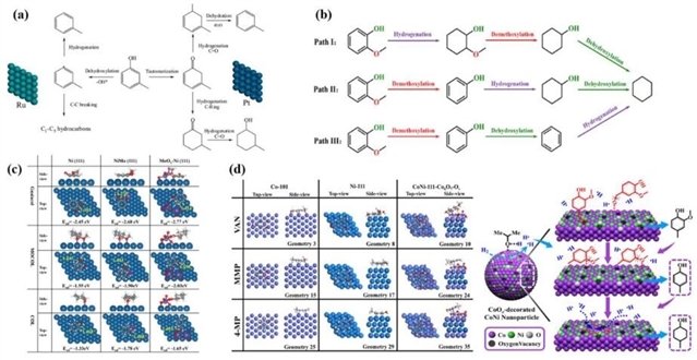 图2 (a)间甲酚在Pt和Ru催化剂表面催化HDO反应路径[115];(b)愈创木酚HDO对CHA的三种可能途径[118];(c)愈创木酚、MOCOL和COL在三个模型表面上吸附构型的优化几何形状[93];(d)优化了V AN、MMP和4-MP的结构,并提出了在CoNi/Al2O3上V AN HDO的机理