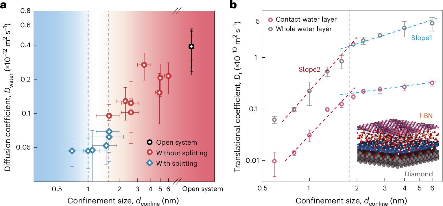 在这项工作中,江颖教授团队开发了一种支持纳米尺度水结构探测的扫描量子传感显微系统(NV-SPM),实现了对纳米限域水的扩散动力学行为与氢键网络结构的探测。利用NV-SPM的兼容高空间分辨和高探测灵敏度的优势,该研究突破了传统手段在纳米限域水观测中的瓶颈,首次在实验上展示了当限域厚度小于约1.6 nm时,水分子的扩散行为显著减缓,氢键网络趋于有序化,并在厚度进一步减小至约1 nm或更小时,完全转变为晶体相的液–固相变现象。曾晓成教授团队通过分子力动力学揭示在该限域体系液固突变的动力学机制。由于NV-SPM的可扩展性,未来可广泛拓展应用于纳米孔道、二维材料界面及其他轻元素体系,为推动纳米流体学、量子传感和材料科学等多学科交叉研究带来新的突破可能。